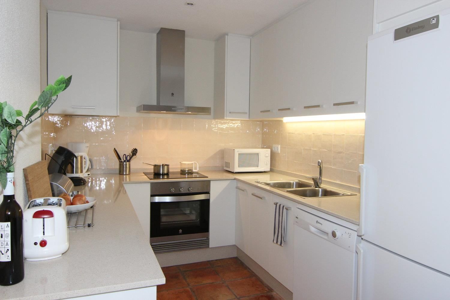 - cocina americana con cocina eléctrica, horno eléctrico, microondas, lavavajillas, refrigerador-congelador, cafetera, calentador de agua y tostador