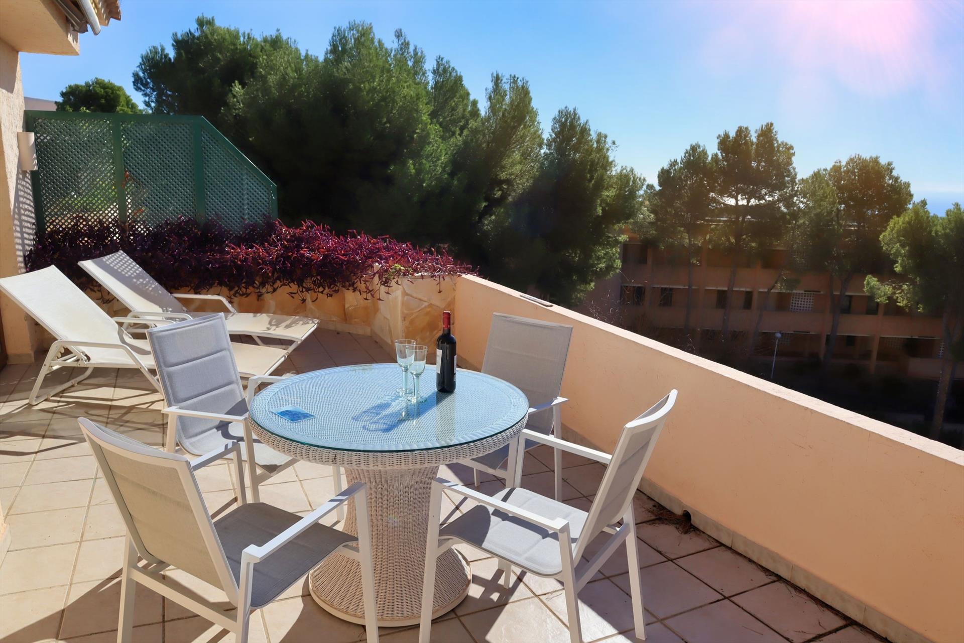 ✅ Amplia terraza privada orientada al suroeste con vistas al mar, al valle y a la piscina