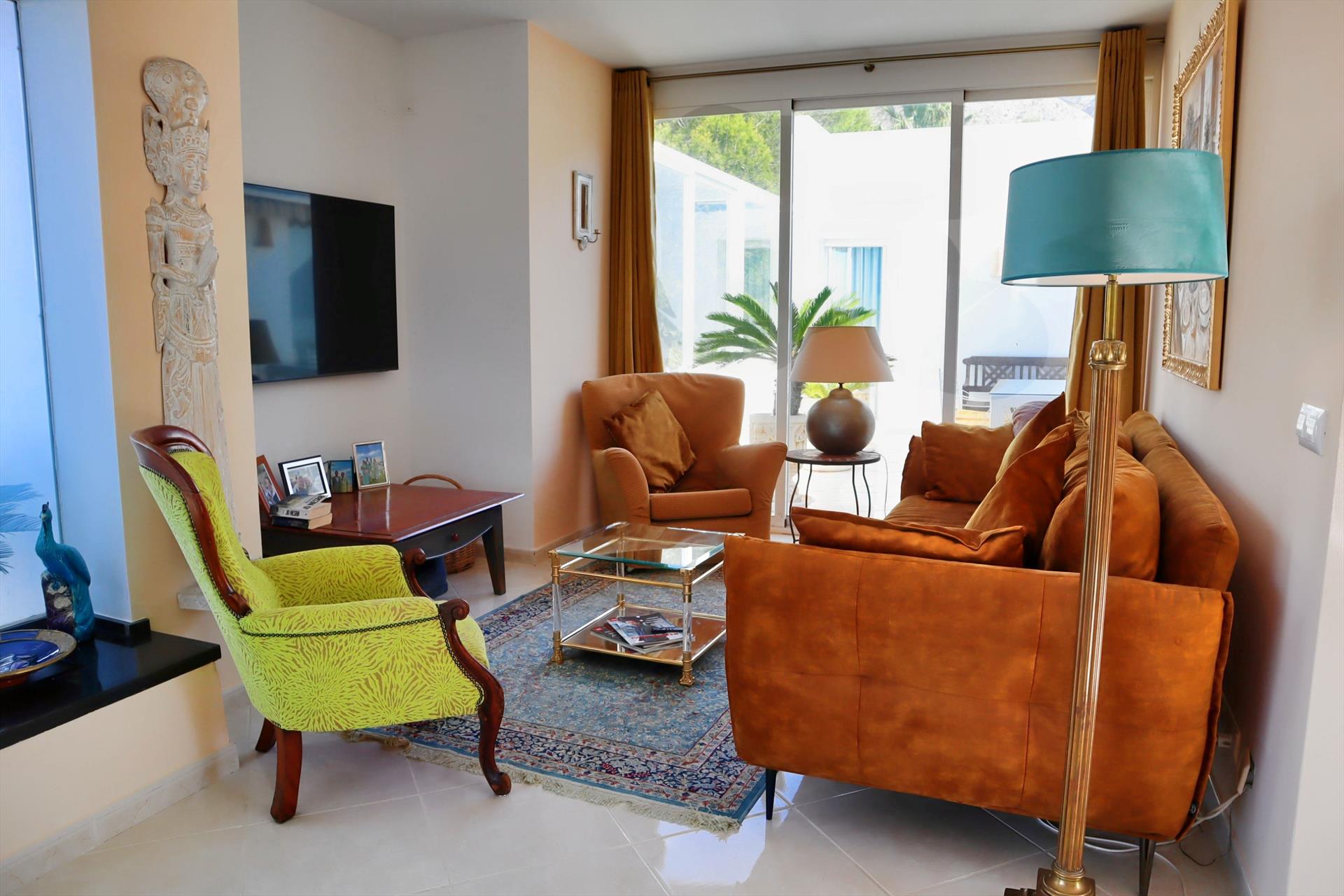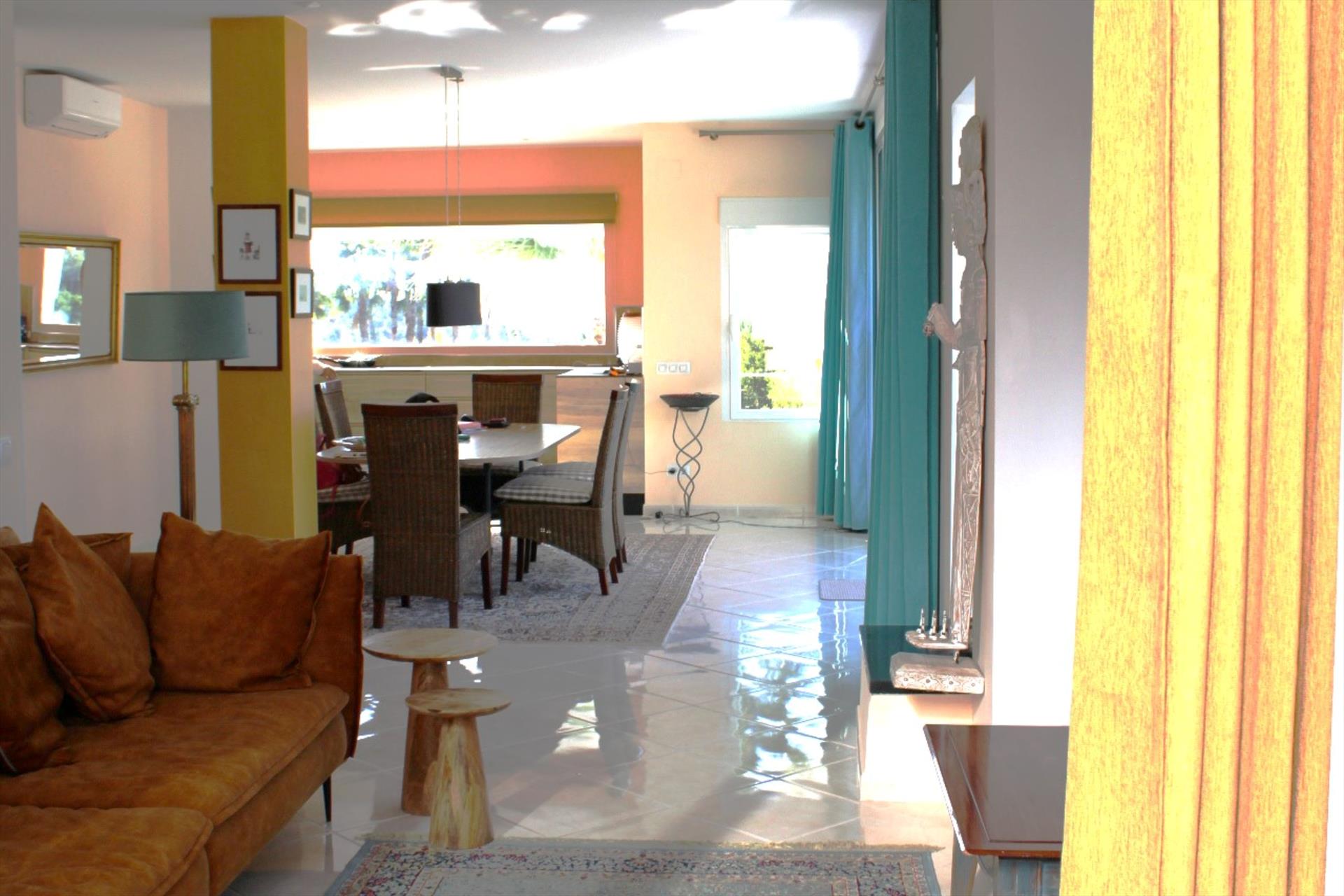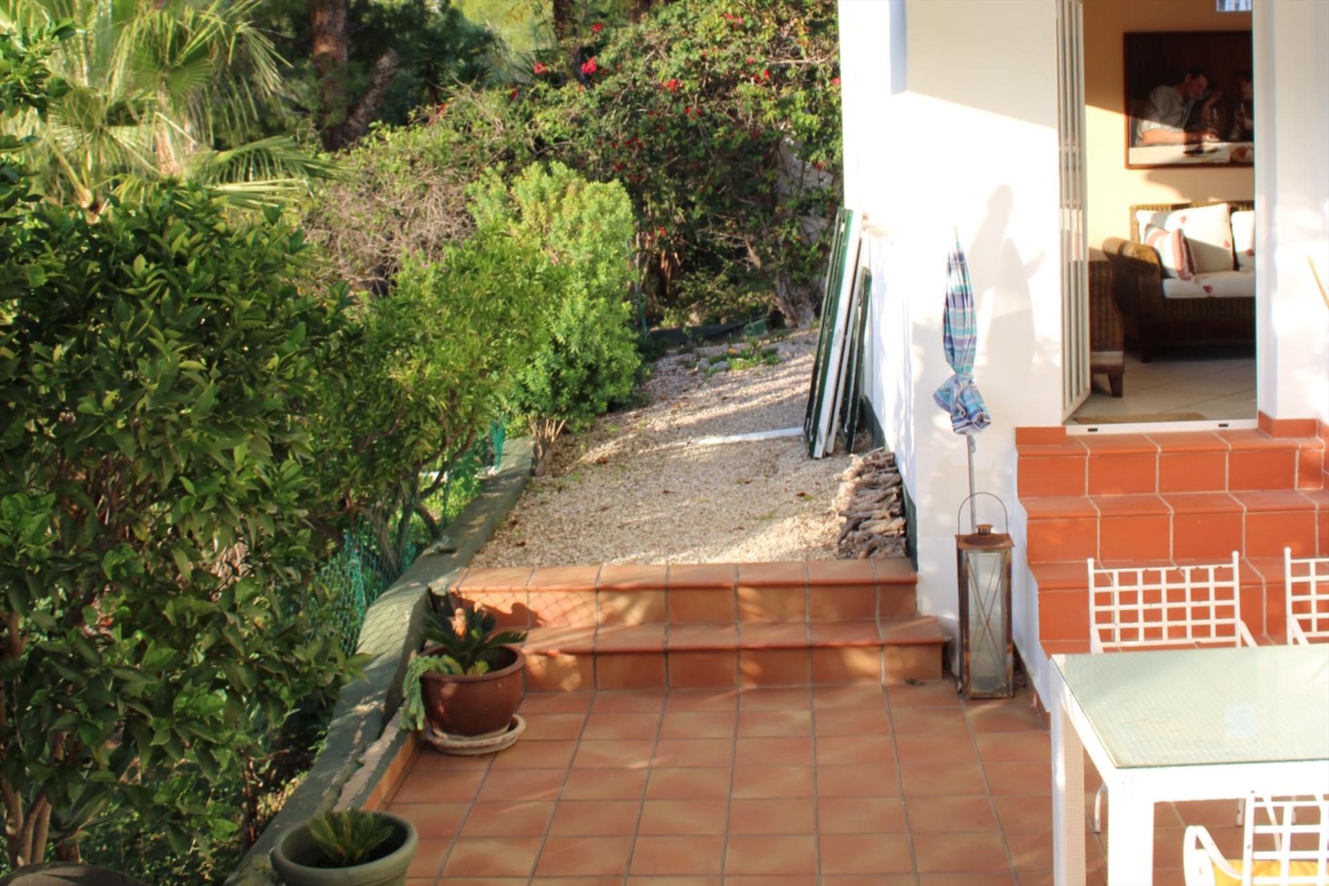 Esta villa de dos plantas, con varias terrazas, se puede alquilar por partes (apartamento Casita Palmera con dos dormitorios en la planta baja) o en su totalidad (5 dormitorios y 4 baños).