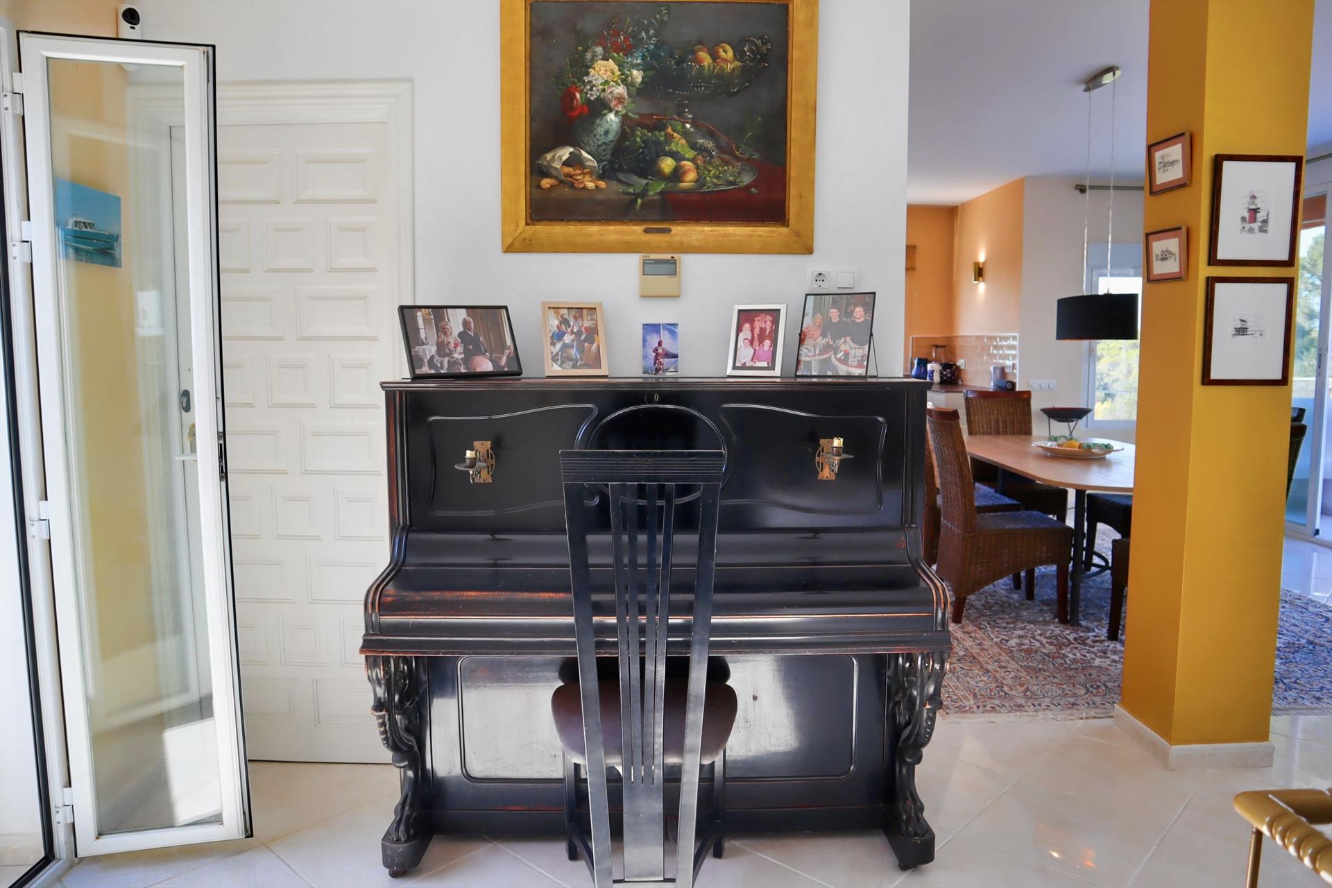 La primera planta (también accesible por ascensor, apta para sillas de ruedas) cuenta con un dormitorio principal (con aire acondicionado) con baño en suite, un aseo independiente para invitados y una amplia sala de estar-comedor (con aire acondicionado). Desde esta sala se accede, mediante puertas correderas, a una gran terraza exterior con vistas al mar y a la montaña, con fregadero exterior, lavadora y gran barbacoa Broil King. Junto al salón hay una zona de estudio/lectura (cerrable con puertas correderas de cristal), ideal para teletrabajar. La moderna cocina abierta, equipada con electrodomésticos Bosch, tiene un gran ventanal panorámico con vistas al mar y una despensa amplia con fregadero y secadora. Gracias a los grandes ventanales, hay mucha luz natural. Tanto en la planta baja como en la superior hay varias terrazas, rincones y balcones alrededor de la casa, lo que permite seguir siempre el sol. También hay toldos eléctricos en ambas plantas.