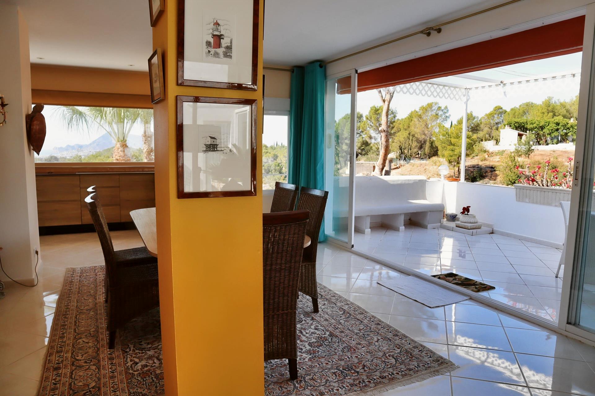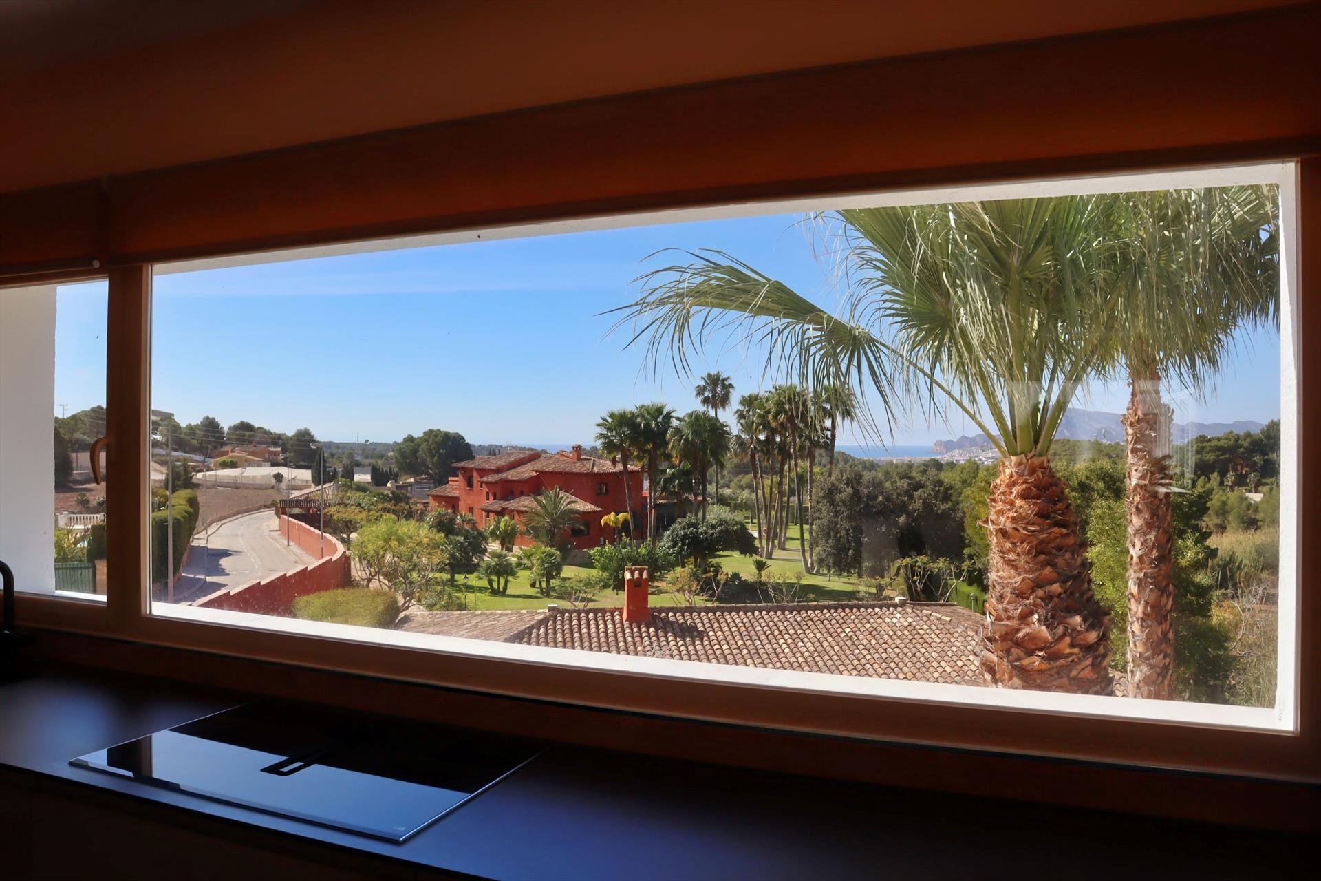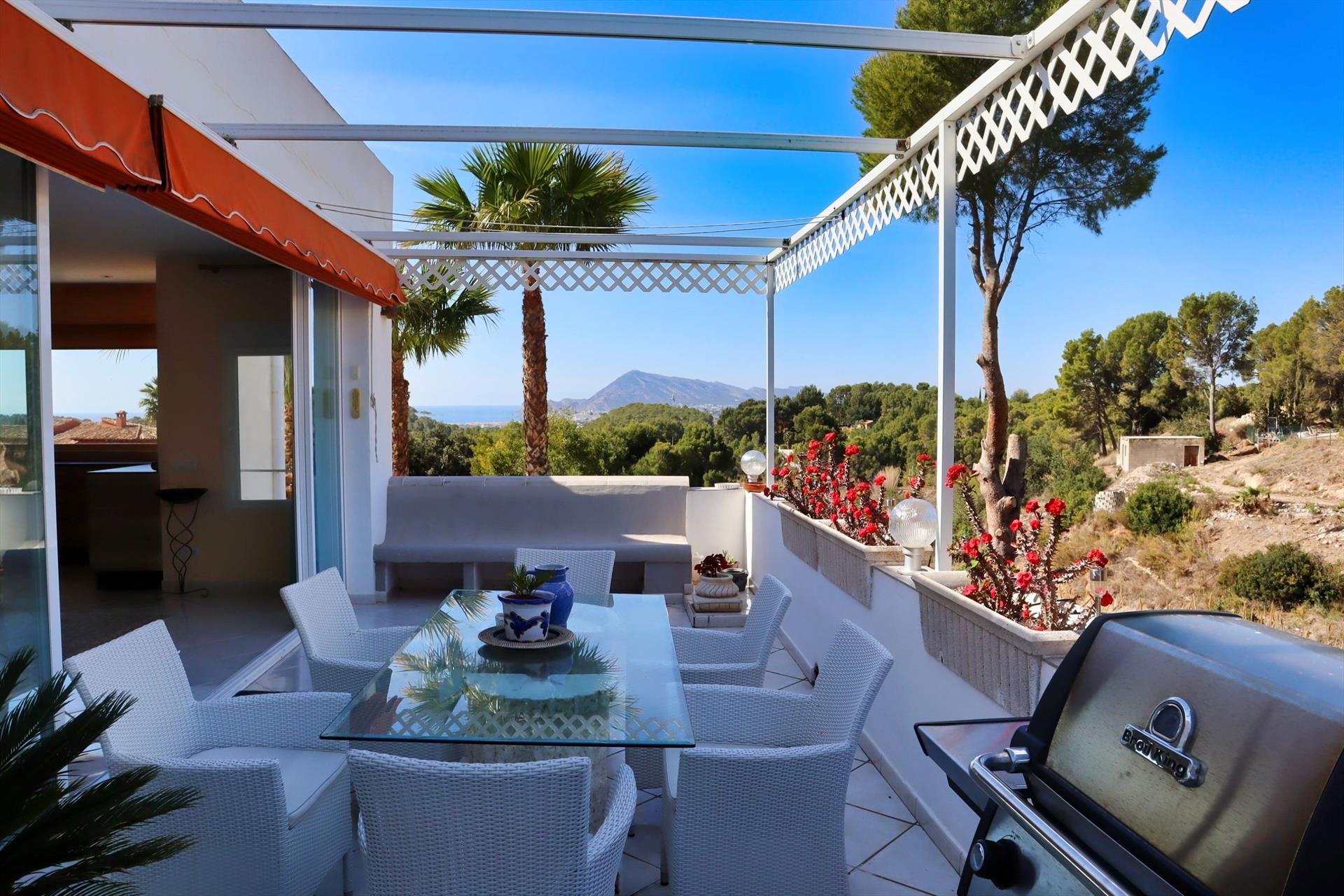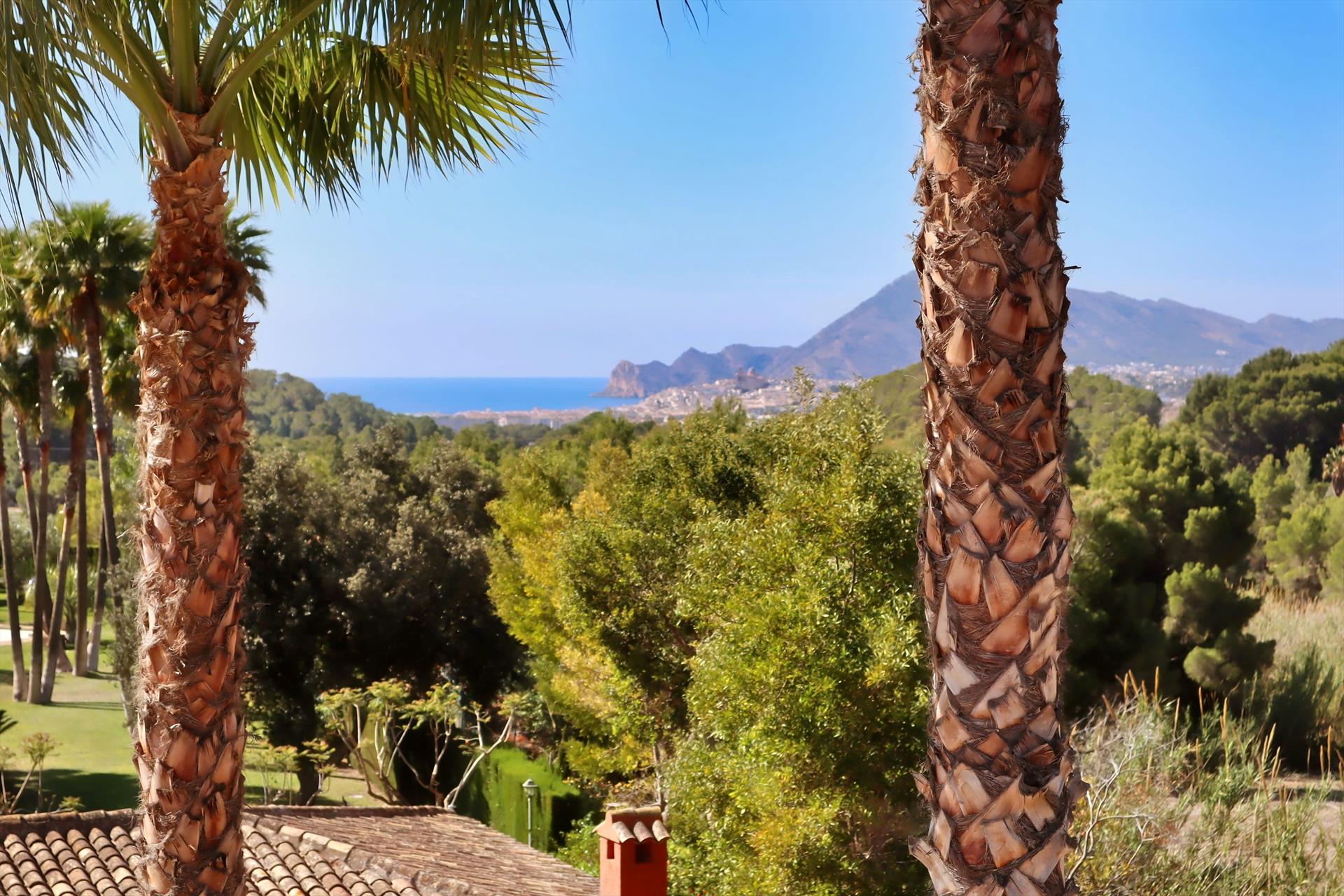 La villa cuenta con un precioso jardín mediterráneo, con numerosas palmeras y árboles frutales, y está situada en una tranquila urbanización, a solo 500 metros del encantador pueblo de Altea la Vella, donde hay restaurantes, supermercados y tiendas. La tranquila playa de cantos rodados La Olla está a menos de 3 km y el pintoresco pueblo de Altea —también llamado “La Perla de la Costa Blanca”, conocido por sus calles blancas y su basílica en lo alto— está a solo 4 km. La villa se encuentra al pie de la Sierra de Bernia, una impresionante cadena montañosa ideal para hacer excursiones, y ofrece, al mismo tiempo, vistas al mar Mediterráneo y a la bahía de Altea. La zona es perfecta para senderismo, ciclismo, mountain bike y golf. El club de golf de Altea “Don Cayo” (9 hoyos) está a solo 2 km de la villa, en el pueblo de Altea la Vella. En la zona de Benidorm hay varios campos de golf de 18 hoyos (a 15 minutos en coche).