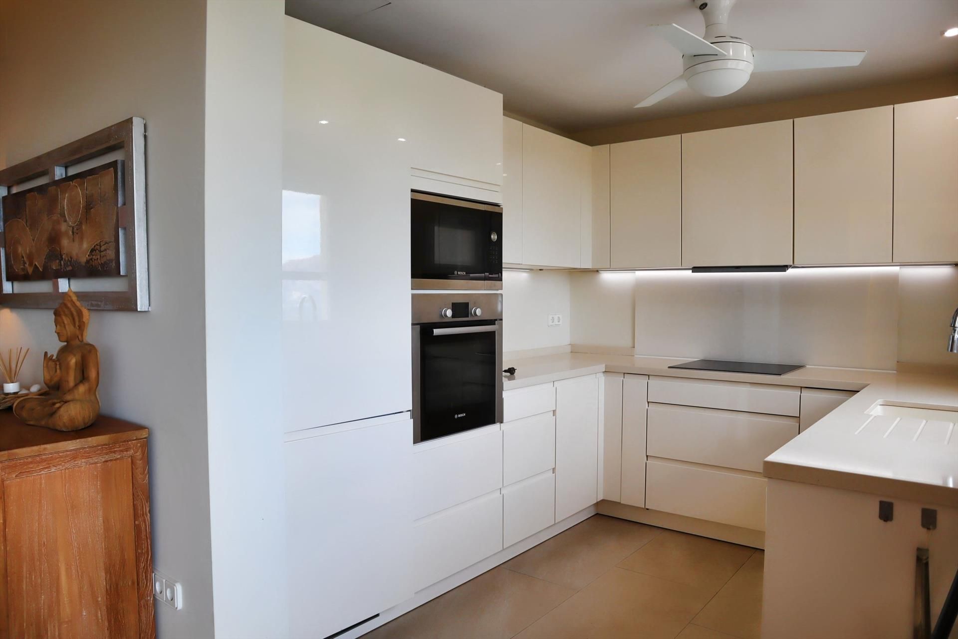 - Wohnküche mit Induktionsherd, Elektroofen, Mikrowelle, Geschirrspülmaschine, Kühl-Gefrierkombination, Kaffeemaschine, Wasserkocher und Toaster