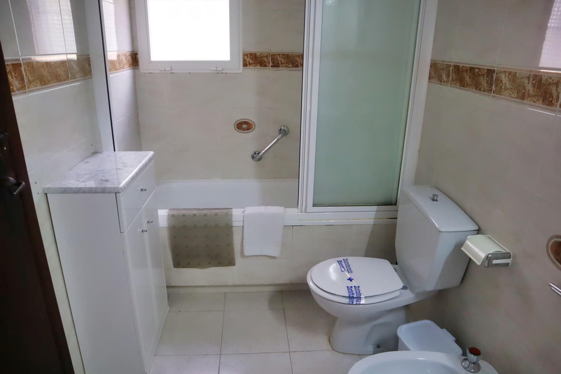- ensuite Badezimmer mit Einzelwaschbecken, Duschbadewanne, Bidet, Toilette und Föhn