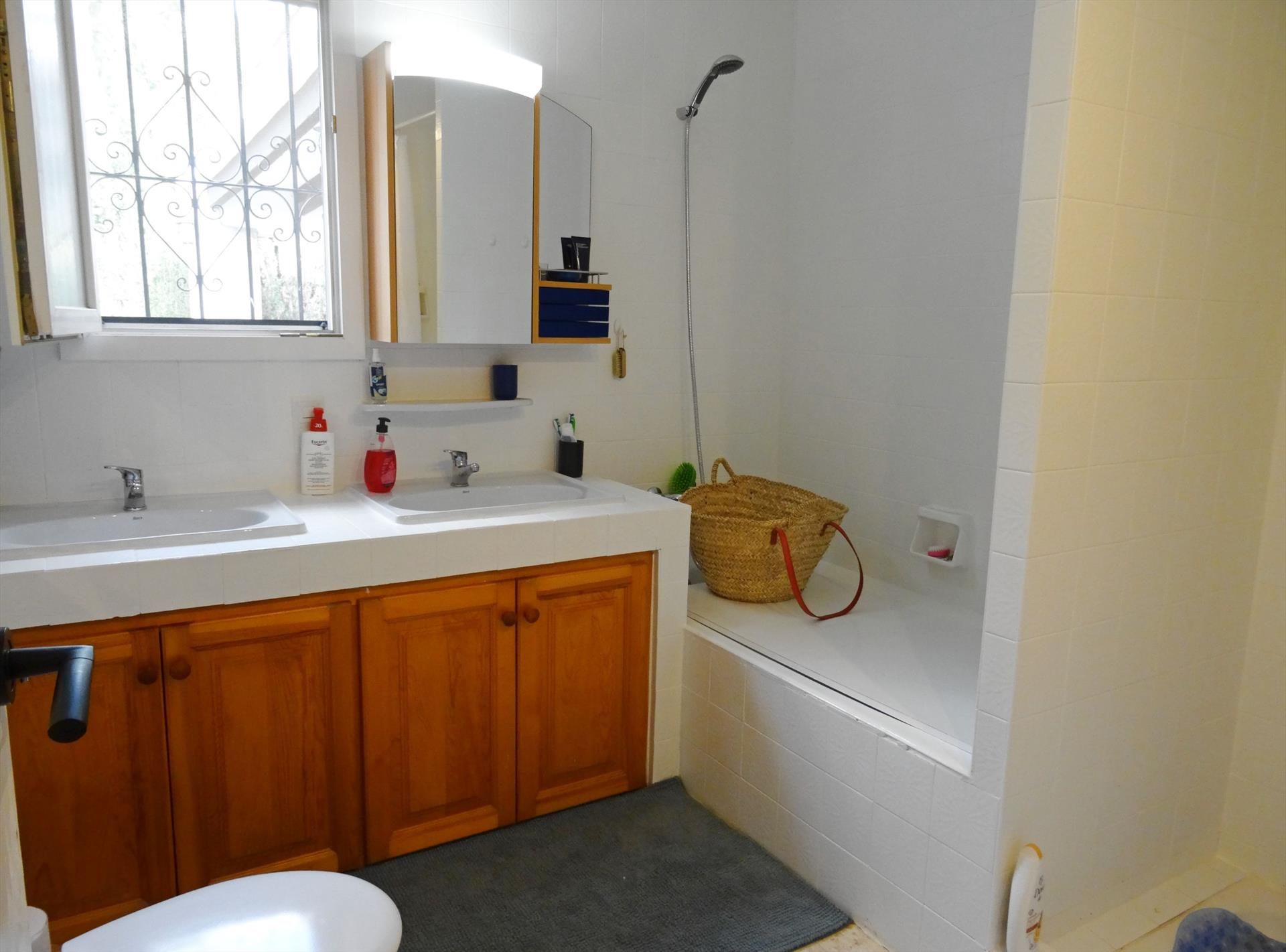 - Badezimmer mit Doppelwaschbecken, Badewanne, Dusche, Toilette und Föhn