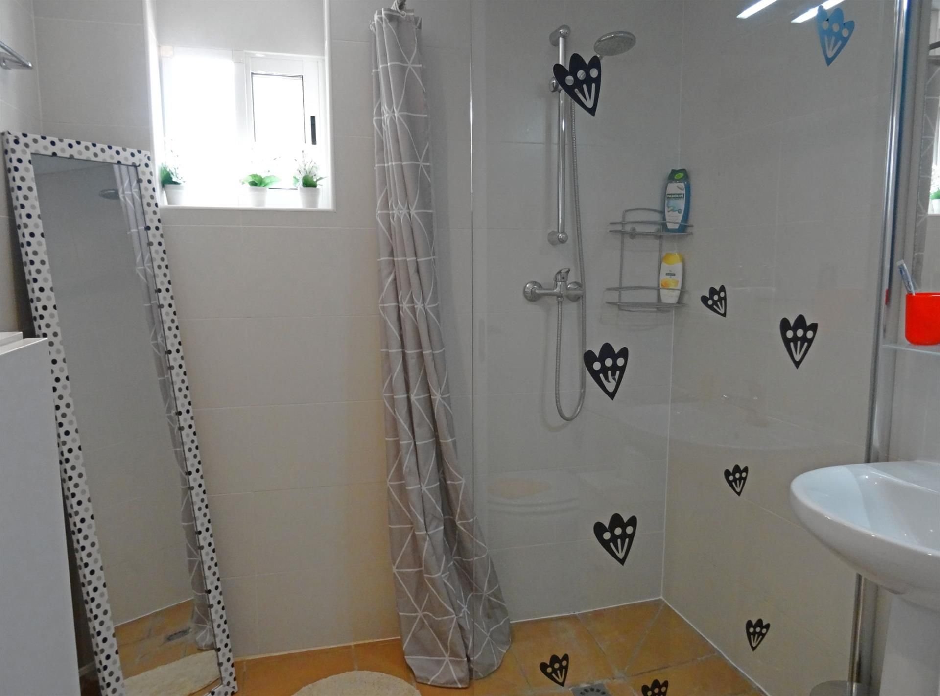 - Badezimmer mit Einzelwaschbecken, Dusche und Toilette