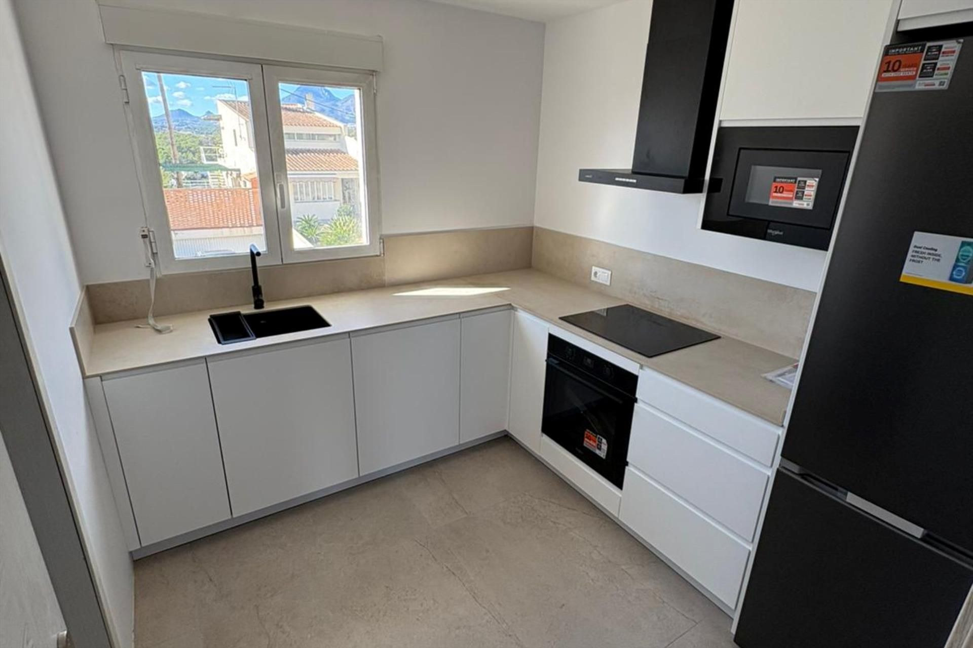 - kitchen with electric hob, electric oven, microwave, dishwasher, refrigerator-freezer and electric kettle