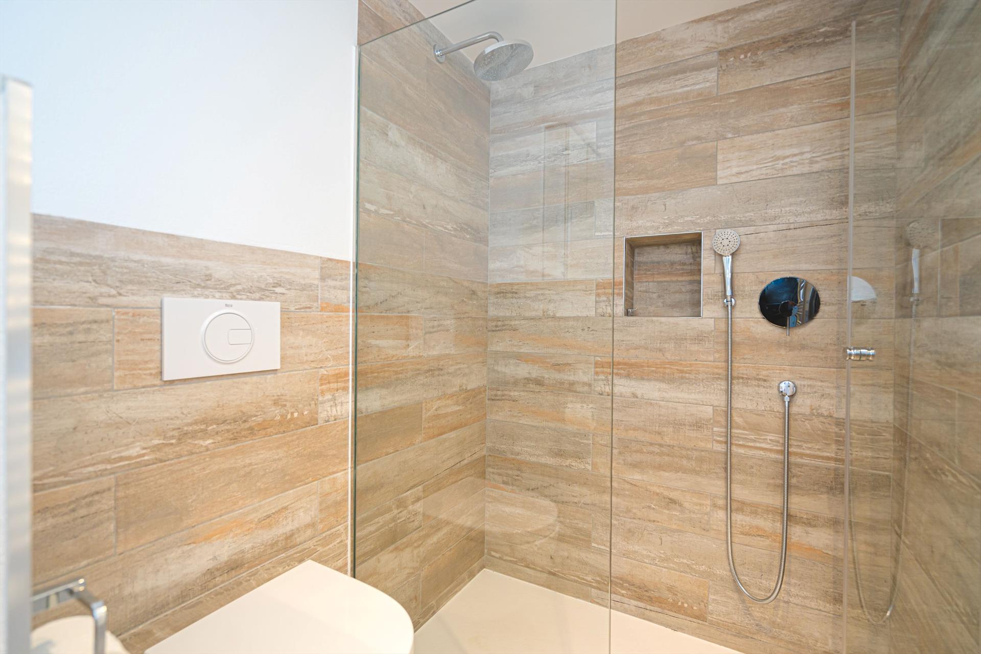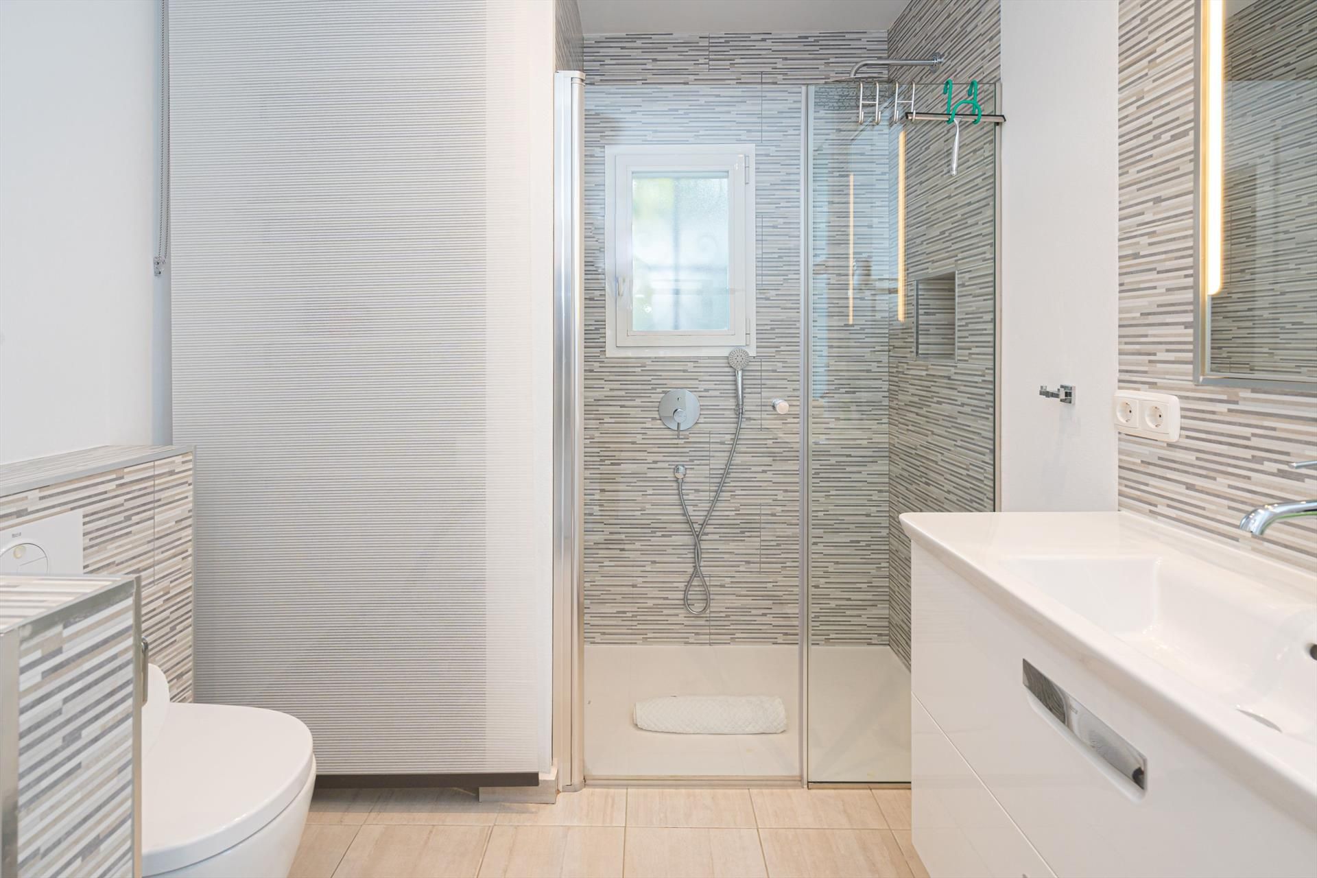 - bathroom with single washbasin, shower, toilet, and hairdryer
