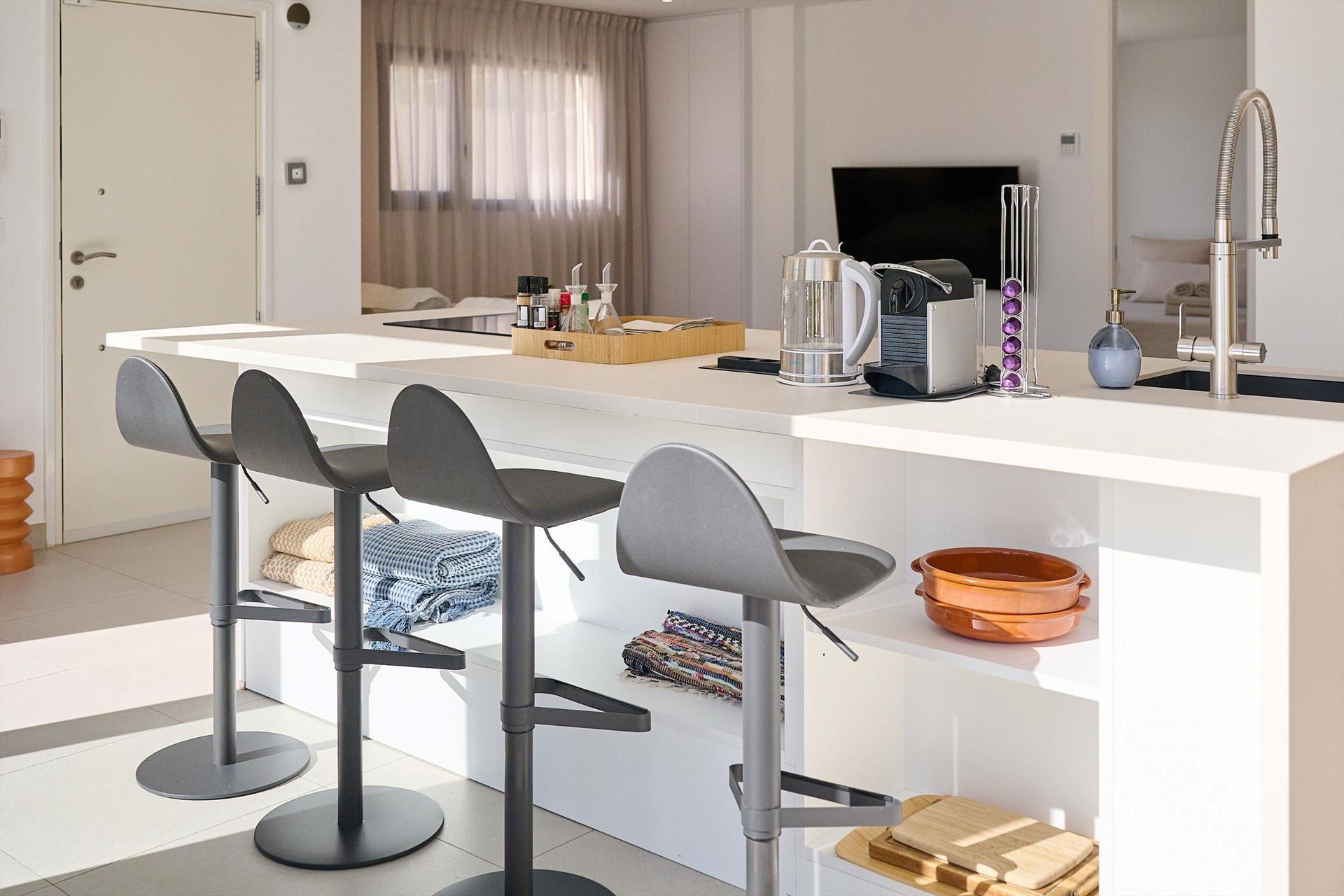 - cuisine américaine avec cuisinière à induction, four électrique, four à micro-ondes, lave-vaisselle, réfrigérateur-congélateur, cafetière électrique, grille-pain et presse-citron