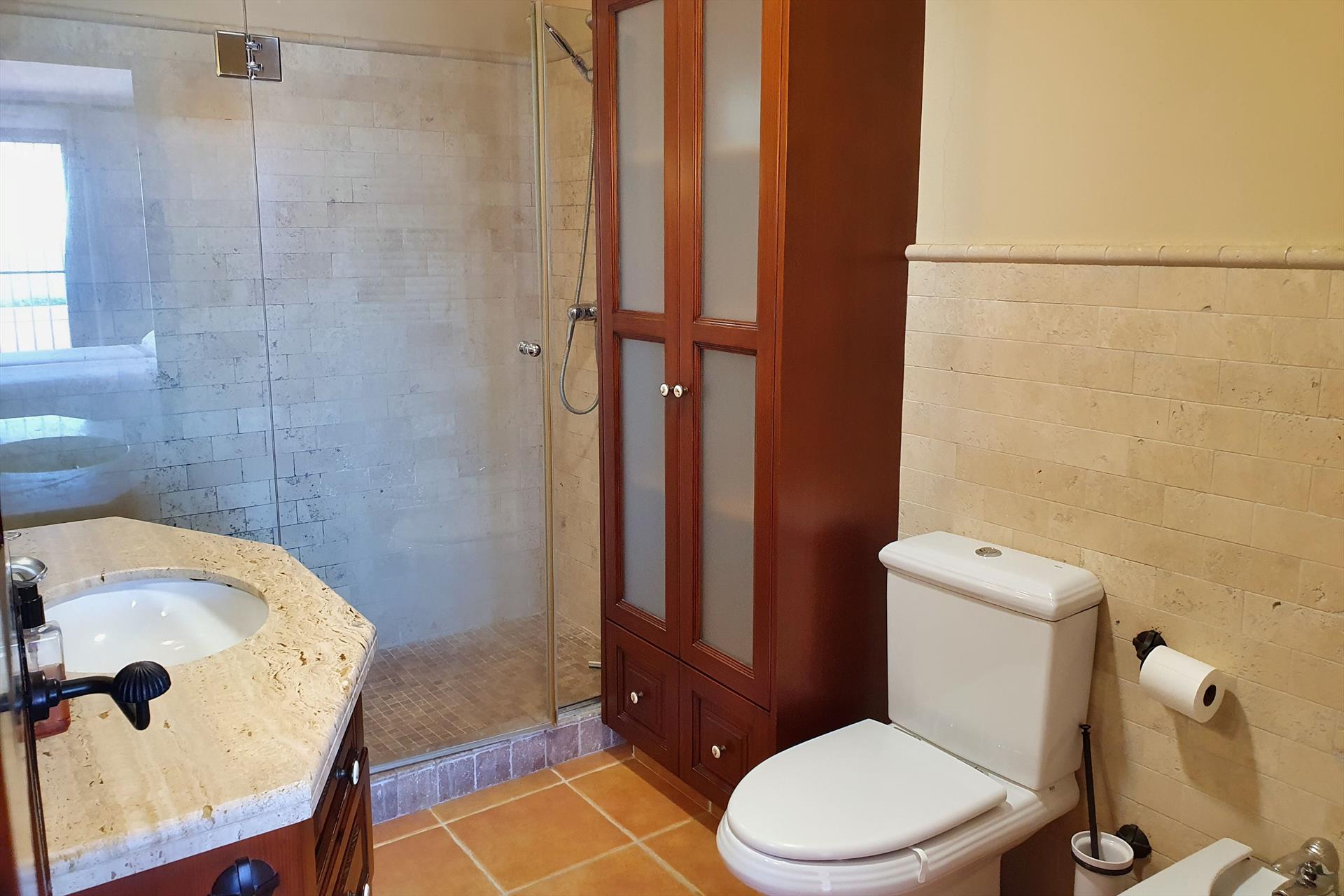 - badkamer met enkele wastafel, douche en toilet