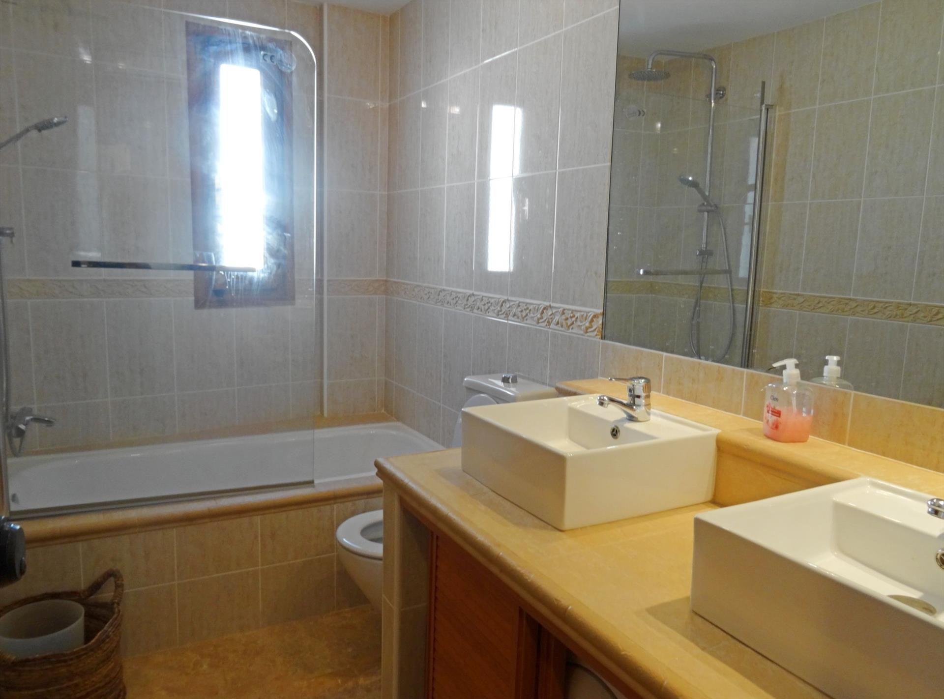 - badkamer met dubbele wastafel, douche/badcombinatie en toilet